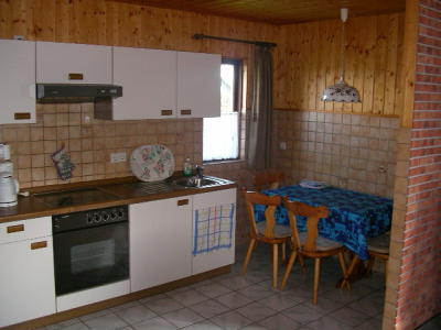 Wohnküche: Polstergarnitur, Tisch, Anrichte, Farb-TV, Satellitenprogramm,